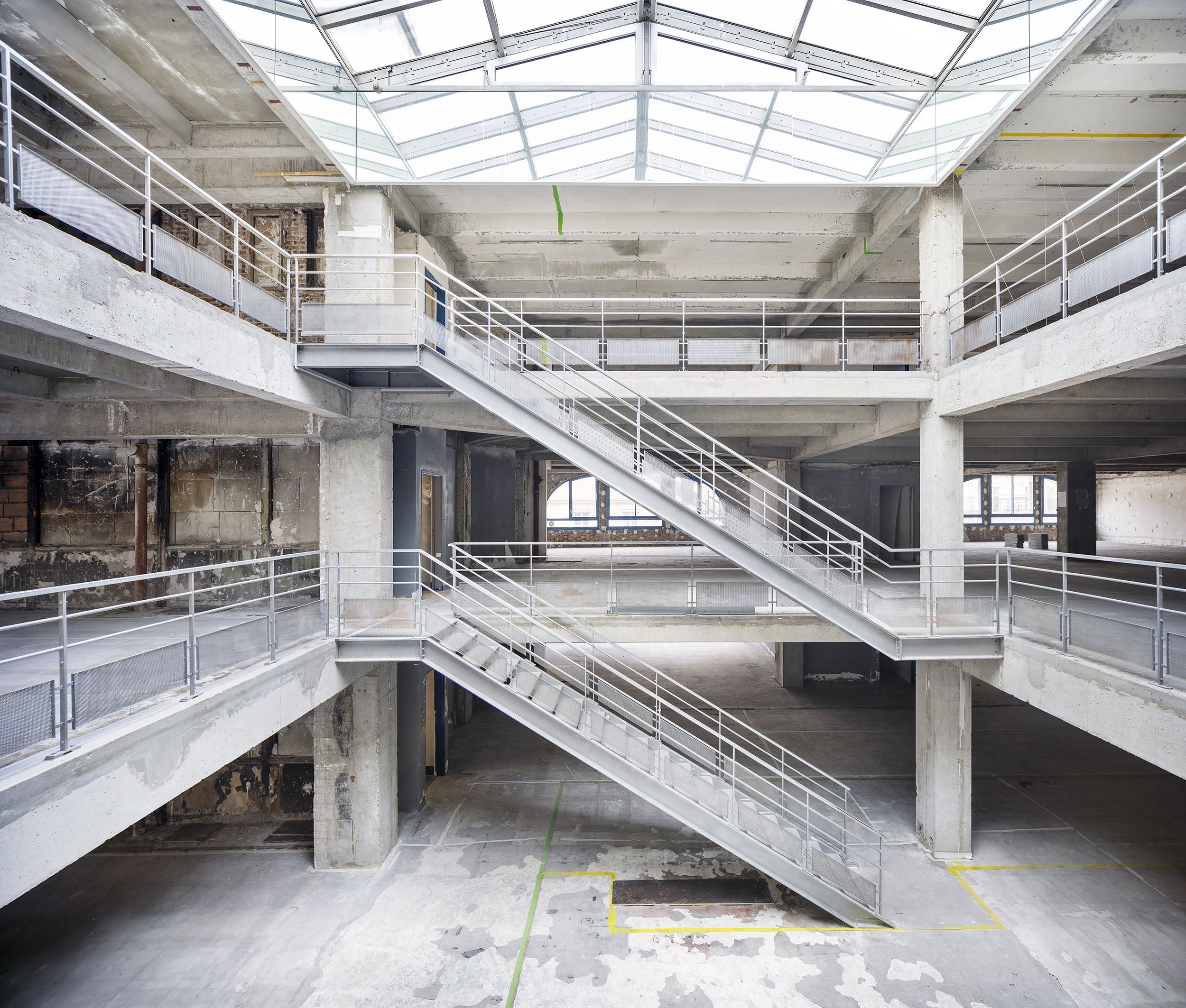 At the heart of the project, the atrium underwent significant refurbishment. Enlarged from 7 x 8 m to 11 x 12 m, it redefines the circulation routes, bringing more light into the heart of the building and now structuring the entire building around walkways and a monumental staircase. This reconfiguration was accompanied by major work on the core structures, including the renovation of one staircase, the creation of another, partial demolition and the relocation of vertical circulation routes, in order to bring the building into line with current regulatory requirements, particularly regarding public access buildings and fire safety.